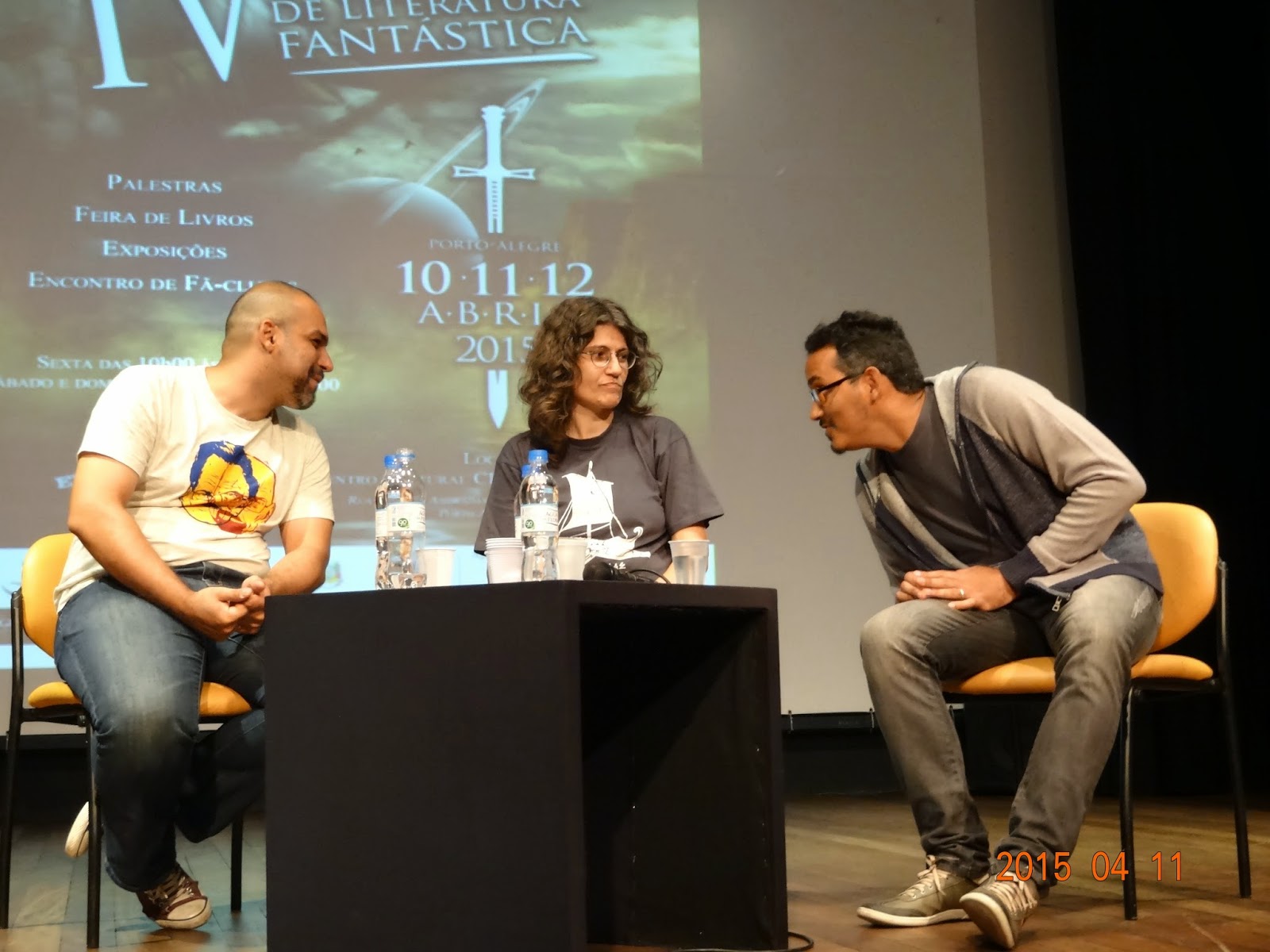 Às 14h40 assisti o terceiro bate-papo desta tarde de sábado, “Que Fase!  A Literatura Fantástica Aqui e Agora”, com a participação dos autores Eric Novello, Felipe Castilho e Gustavo Girardi Brasman, com a moderação da professora universitária e livreira Nicole Siebel.  Em meio a tiradas espirituosas, os três autores discorreram sobre suas motivações literárias, seus trabalhos e carreiras, com conselhos aos jovens (ou não tão jovens) da plateia que aspiram ser escritores.
