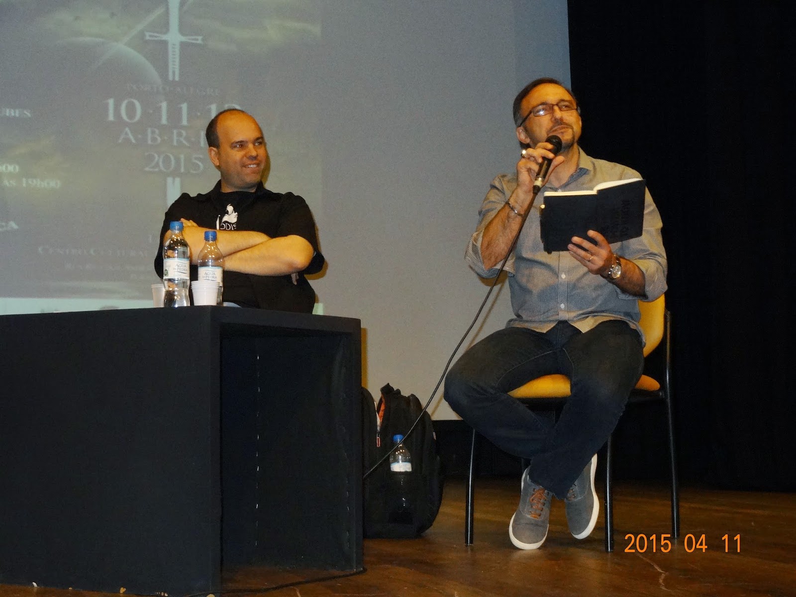 Em seguida assistimos a sexta e última mesa-redonda desta tarde de sábado 20.000, “Um Real Imaginário, um Fantástico Extraordinário”, com a participação dos amigos escritores Simone Saueressig, Christian David e Duda Falcão, com a moderação de Cássio Pantaleoni.  Um bate-bola afinado, divertido e instigante, embora por vezes tenso, entre autores e moderador, nesta que se constituiu em uma das melhores mesas da tarde.  Durante uma de seus apartes, Simone falou de um enredo de Stephen King em que o cadáver de uma garotinha foi encontrado nos escombros de um incêndio medonho.  O corpo dela e suas roupas pareciam estranhamente intactos, intocados pelas chamas.  Ela fora aparentemente morta pela inalação de fumaça.  Neste instante, cochichei ao ouvido da Flávia, “a coisa mais medonha que consigo pensar, uma situação que me deixa arrepiado, é se o cadáver da garotinha houvesse sido plantado nos escombros do incêndio.  E se ela houvesse sido morta noutro sítio e levada para lá, para disfarçar a causa real da morte?”  Ela me olhou assustada e sussurrou: “Eu pensei exatamente a mesma coisa...”  Tsk, tsk, tsk, escritores...  Bravo como um Vasco da Gama ante um oceano alienígena, Pantaleoni sugeriu, a título de exercício de imaginação literária, que se elaborasse um enredo sobre um centauro-zumbi que se teria transformado em vampiro e, posteriormente, mordido por um lobisomem.  Genuíno samba do metamorfo doido, sô!