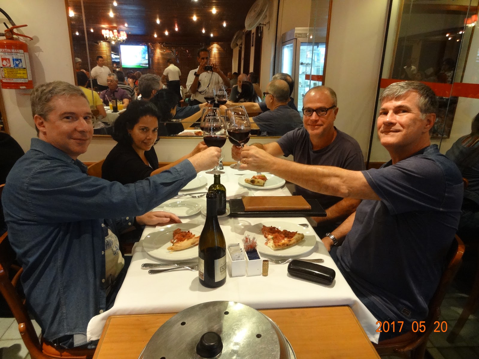 Uma vez no restaurante Beco Band (o mesmo em que já havíamos jantado em 2015), pedimos um churrasco misto para duas pessoas que atendeu perfeitamente a sanha famélica carnívora de cinco de nós: Erick, Alexey, Beraldo, Raphael e eu.  Como o Ricardo França não come carne, optou por um peixe.  Quando o garçom retornou, informando que o peixe estava em falta, sereno como sempre, França adotou seu plano B: massa com molho de tomate.  O repasto foi regado por três garrafas do Dom Cândido Documento Merlot 2011, que desceu tão macio e redondo quanto esperávamos.