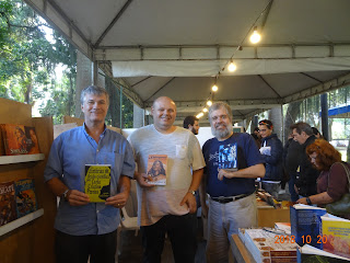 Cheguei ao estande nº 57 às 16h00, lá encontrando Débora e Luiz Felipe.  Ao contrário de ontem, a feira de livros estava bombando.  O fita de concreto que percorre os jardins em seu comprimento maior estava inteiramente repleta de transeuntes, leitores, carrinhos de bebê, crianças correndo de um lado para outro, e demais obstáculos ao deslocamento célere deste autor já um bocado atrasado.